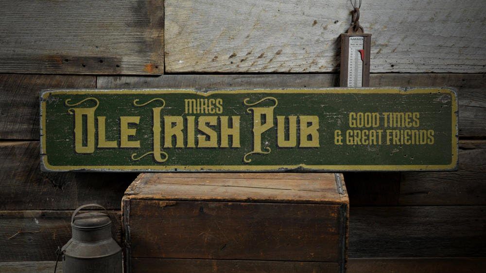 Ole Irish Pub Wood Sign, Custom Bar Owner Name Gift, Good Times & Great Friends Home Decor – Rustic Hand Made Vintage Wooden Sign – 5.5 x 24 Inches