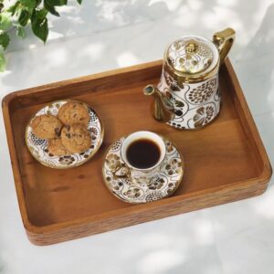Construction : Crafted from premium acacia wood, our serving tray is not only functional but also a work of art. Its smooth surface and rich, natural hues make it an elegant and durable choice for any occasion. Dimensions: 38 x 25 x 5 cm High performance design : Our acacia wooden tray is pre-treated with a blend of natural oils and waxes and includes built-in handles. Acacia is harder than most other woods, with superior scratch resistance and is non-slippery. Acacia is resistant to liquid absorption. This wooden tray is less prone to cracking or warping than other woods and easy to clean. It will preserve the rich color and last years if properly maintained. Environment friendly: Acacia is one of the most sustainable trees. This environment safe wooden serving tray is attractive and is not only ideal for serving beverages and snacks to guests in restaurants, homes or parties but can also be used as an organizer for your dining, study or office tables. Thoughtful gift: Our wooden serving tray makes a thoughtful gift for housewarmings, weddings, anniversaries, or any special occasion. Its timeless appeal and practicality make it a gift that will be treasured and used for years to come.”