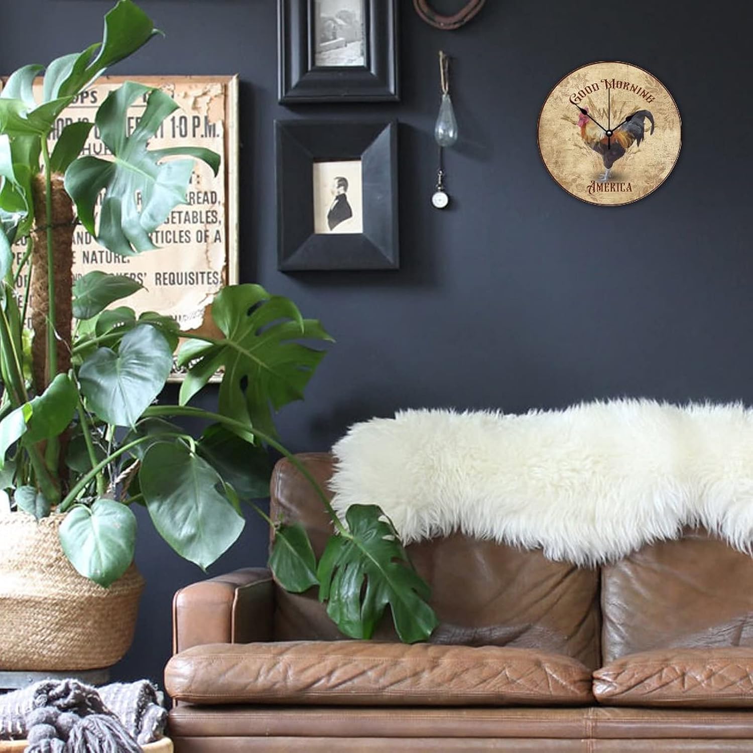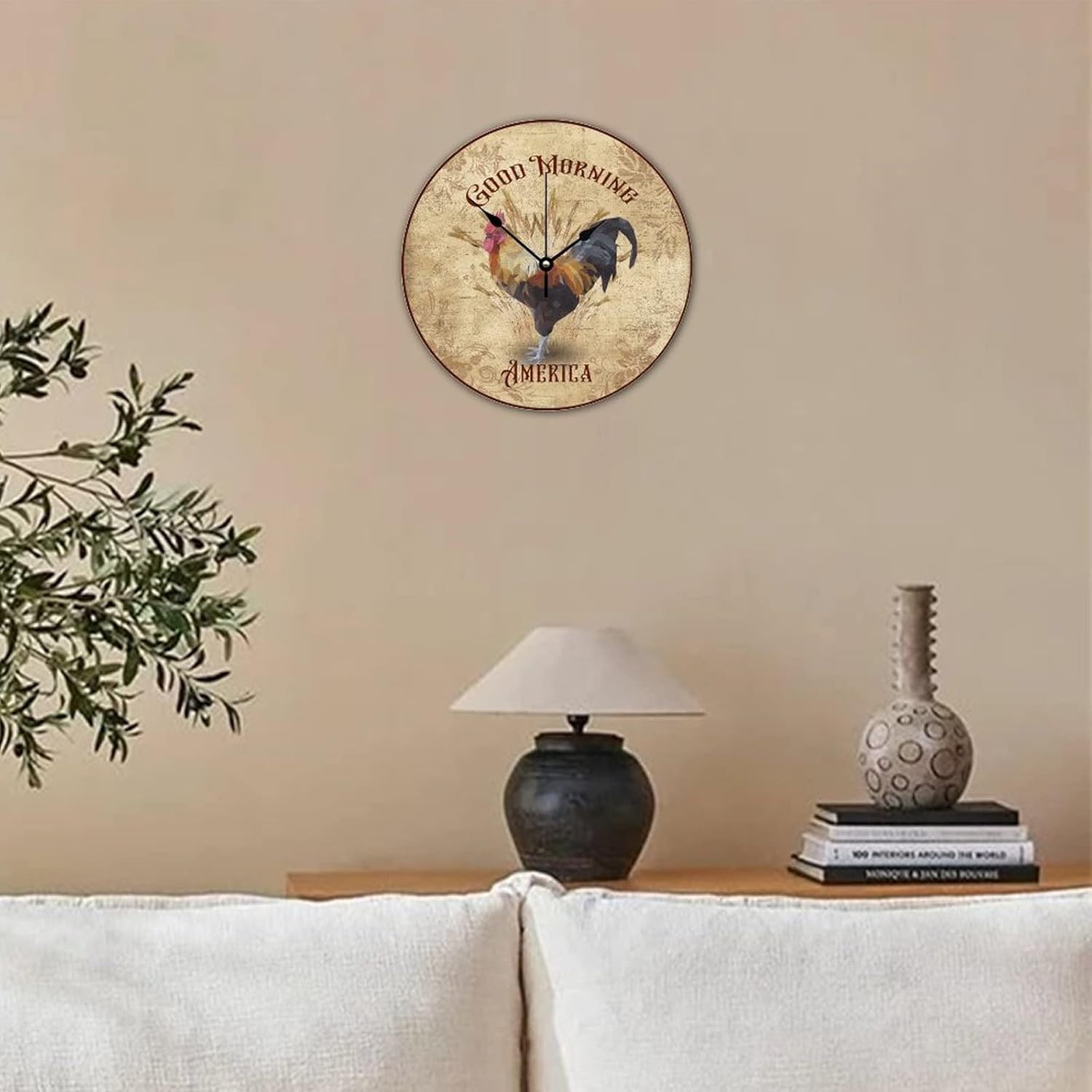 WengBeauty Rooster-Good Morning America Wall Clocks Morning Rooster Wooden Round Clock Vintage Pet Lover Gift Battery Operated Living Room Kitchen Home Bathroom 15×15 inches